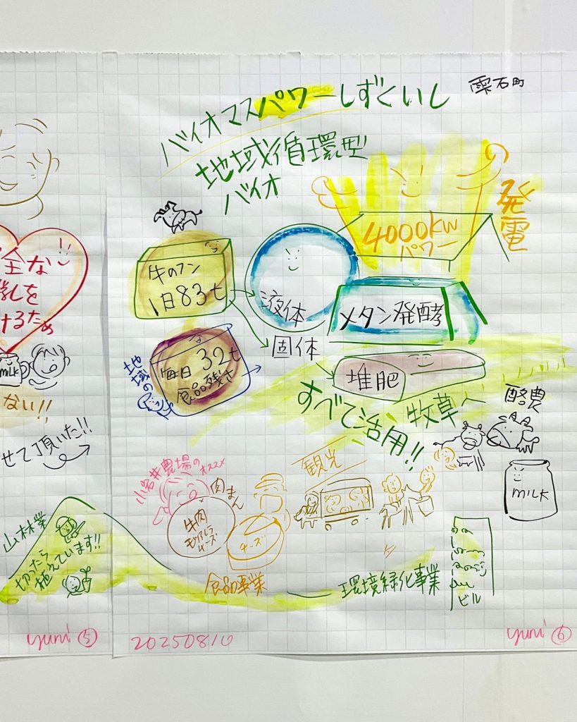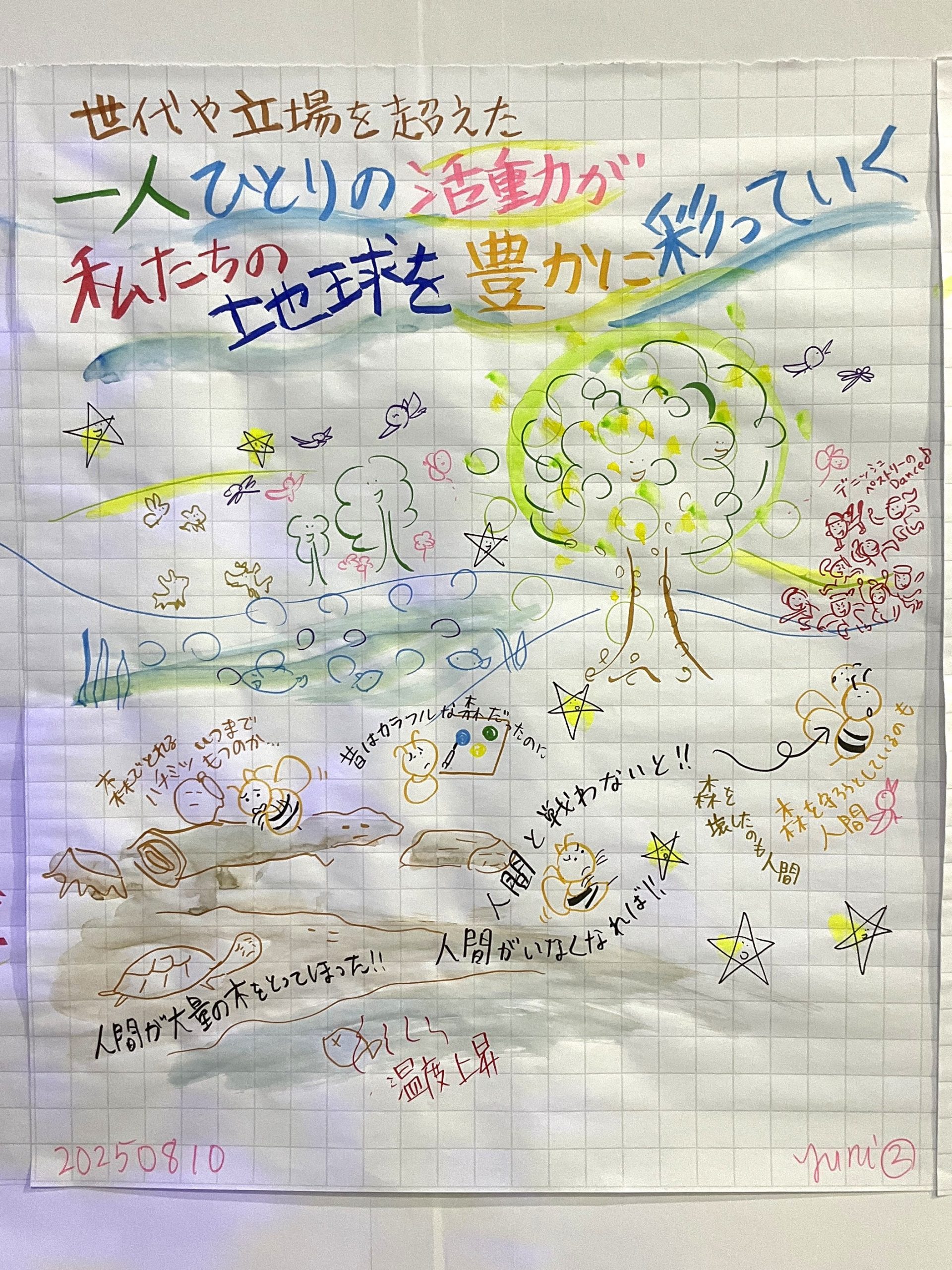 ↑上の絵になんとか描けた活動の一部を紹介すると、緑を守る活動としては、地元の里山・上世屋で雪遊びをしたり、希少種ミツバシバの保護、木林に遊歩道をつくる、などなど。緑を伝える活動としては、ブナ林で小学生に森林学習。京都最大のブナの大きさを測って成長を実感できる体験、などなど。緑に触れることで命を感じてもらう活動を行っているそう。